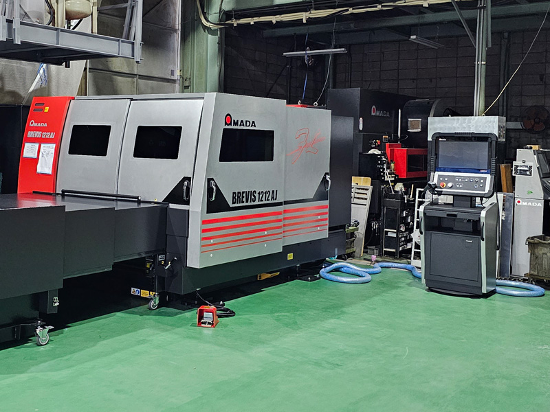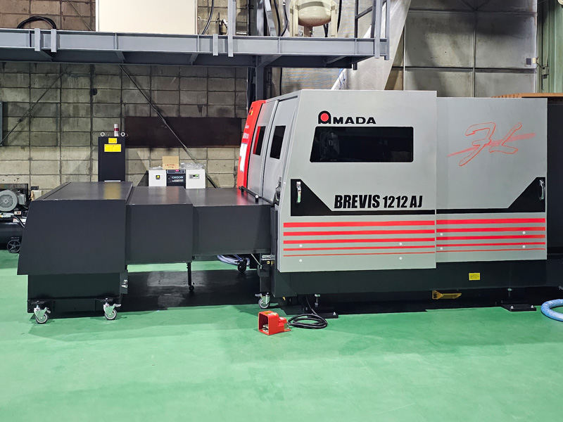 ●最大加工寸法:1219x2438 ●最大加工板厚mm : SS12mm / SUS12mm / AL12mm ●制御機能: X・Y・Z軸(同時3軸制御)+B軸+CF軸 ●その他:4´x8´ リポジショニング仕様